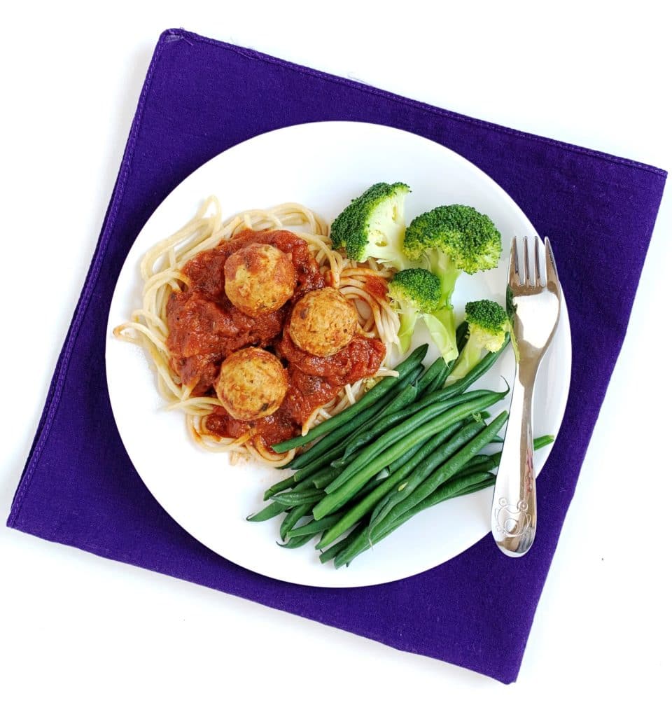 One balanced meal is to serve pasta with olive oil, sauce with ground meat in it, and steamed broccoli. This is a simple and balanced meal.